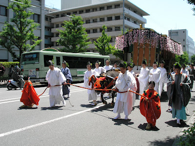 Today we went and saw the Aoimatsuri (Aoi Festival). A very slow moving parade. We got there at around 10:30, waited for about half an hour for it to start/reach us, and then it ended before noon. So the whole procession was about an hour long, just very slow moving. There was no dancing or singing, or music. It was pretty though. A lot of it was the same, so I didn't take a whole lot of pictures (nothing like the other parade). They just walked... and stopped... and walked some more... not real exciting. I also got a picture of a cute little dog in a bike basket.