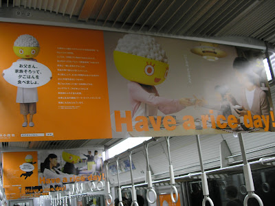 Today we had our internship orientation meeting. I will be working in Yokohama while living in an apartment in Shonandai (in Fujisawa), with an hour commute (35 min by subway and 25 minutes of walking). I never even heard of Yokohama before today... but apparently its the second largest city (in terms of population, I think...) in Japan. At least I won't be that far from Tokyo (about an hour by train from Yokohama). I finally got a chance to take a picture of the special subway cars. The pink ones are Kyoto and the green ones are Nara. The ads here are awesome. You sometimes randomly come across some like the "Have a rice day!" ads that have everyday people with rice bowls for heads. You can't really see it, but the third ad back is a picture of someone with a rice bowl for a head sitting on a subway/train between two other people who have fallen asleep and are resting their heads on each side of the rice bowl (hehe). After the internship orientation I decided to go visit the Kyoto International Manga Museum. It wasn't very big but it was kinda neat. It was converted into a museum from an old elementary school. Just about every floor has walls full of Manga you can just pick up and read. There is even a place on the first floor where you can lie down and read. They also have 100 pictures of Geisha drawn by various Manga authors. Big plans for tomorrow.