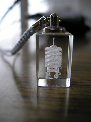 Unfortunately I don't have much for today since it was packing day (I leave for my new home tomorrow). My host parents were happy to fix me Reimen for lunch and Yakiniku for dinner. The first picture is the Toji Temple crystal phone strap I bought at Toji Temple. The second one is the "Laputa: Castle in the Sky" phone strap I bought in Matsuyama and the Doshisha University phone strap I bought at Doshisha. And the last two are of the phone itself. You can set the language to English, so it's not hard to use. Plus it has this cute animation of a sheep running across a landscape, doing... um... random things...